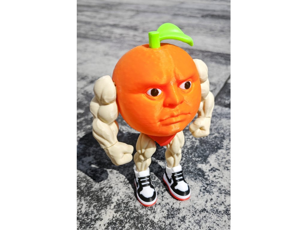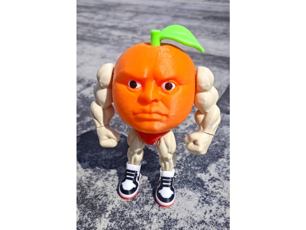 Jeho oranžová hlava s listem na vrchu klame – uvnitř se skrývá nelítostný kulturista s pažemi, co dokáží vymačkat džus i z kovového lisovače. Svaly mu trhají trička (která už dávno přestal nosit) a jeho boty Air Jordans jsou připravené k výpadu na každého, kdo zpochybní jeho vitamínovou dominanci. Nejčastěji ho najdeš v posilovně, jak pumpuje železo a potí čistý džus.